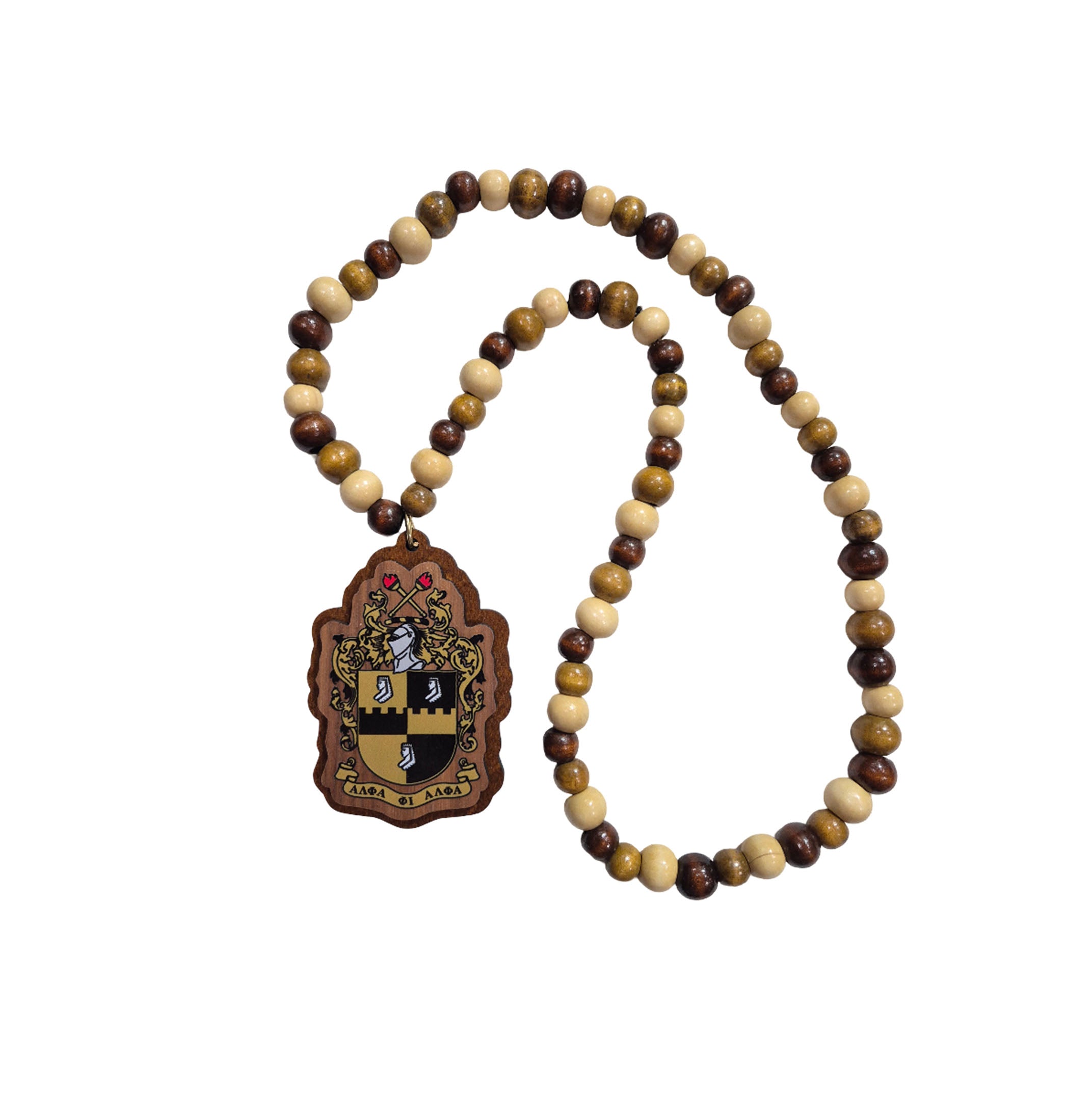 Represent Alpha Phi Alpha Fraternity, Inc. with timeless style and tradition. This handcrafted Alpha beaded necklace features natural wood beads in classic black and old gold colors and a detailed APA fraternity crest medallion for a bold and distinguished look.