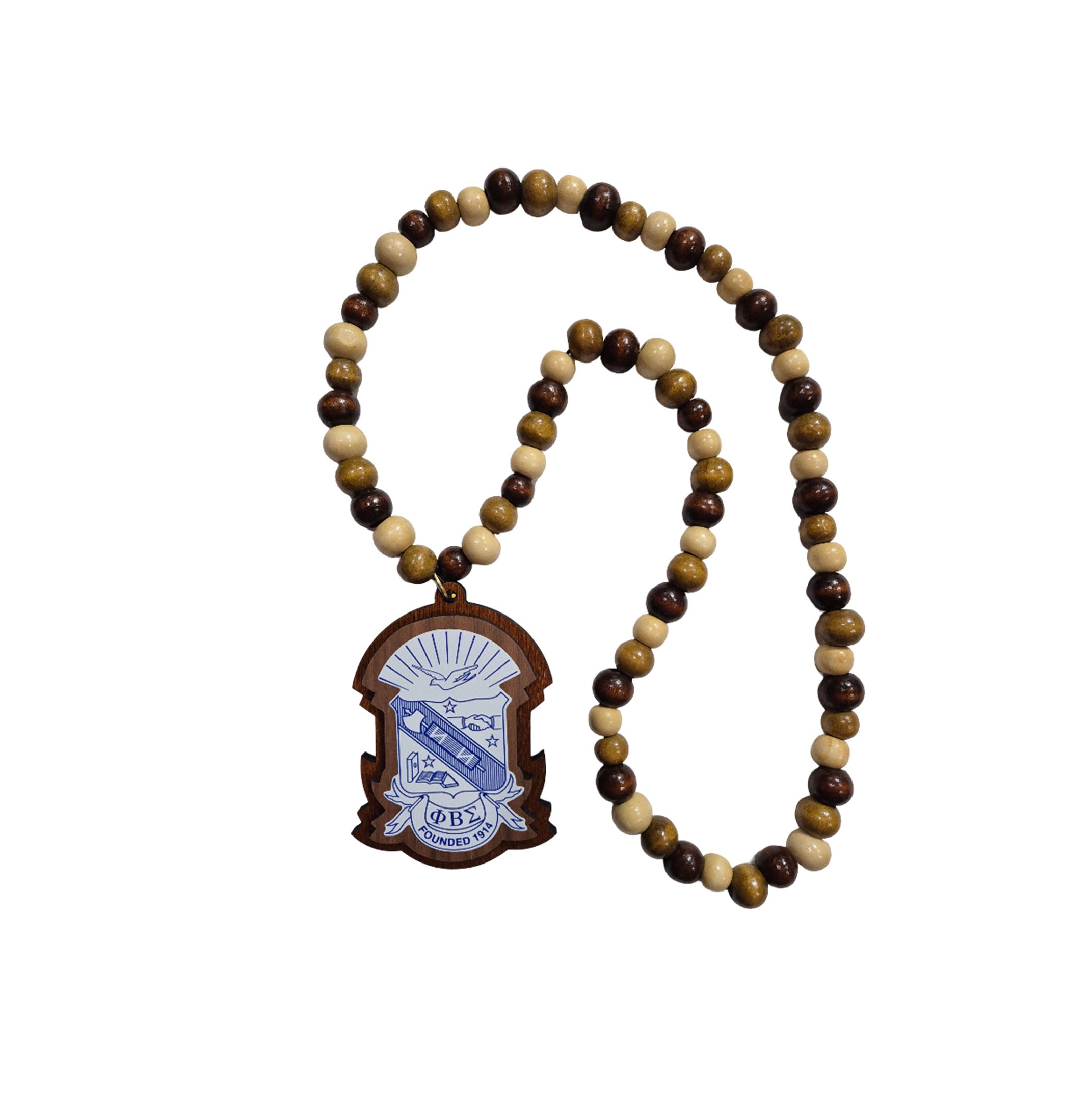 Represent Phi Beta Sigma with timeless style and tradition. This handcrafted Phi beaded necklace features natural wood beads in classic white and blue colors and a detailed Phi Beta Sigma fraternity crest medallion for a bold and distinguished look.