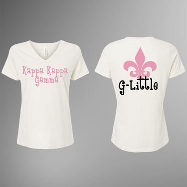 This soft and flattering white V-neck tee features “Kappa Kappa Gamma” in light pink on the front with your chapter name below, and a large pink fleur-de-lis with the word “G-Little” on the back for an elegant touch.