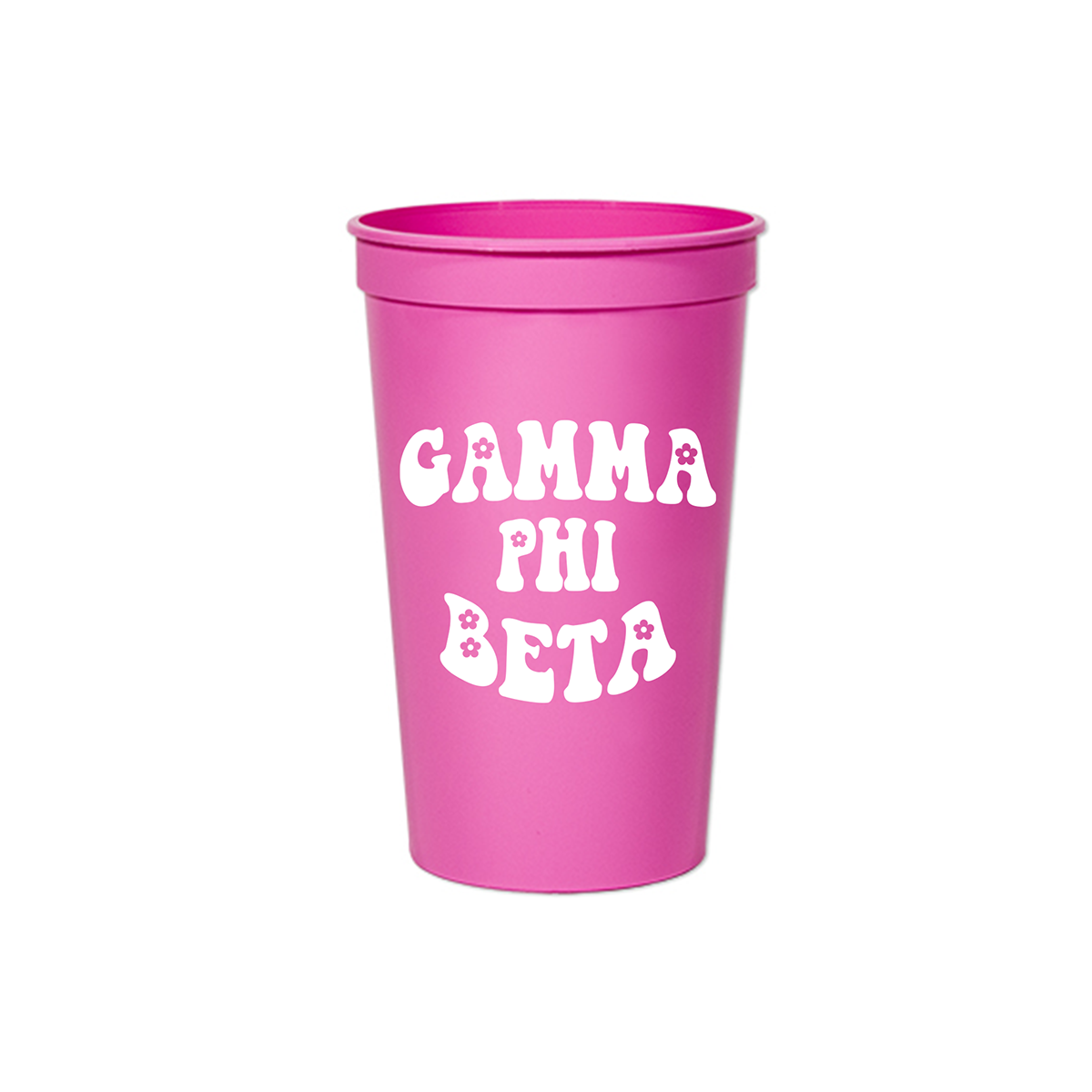 Show your Gamma Phi Beta pride with this pink reusable 16oz stadium cup, featuring bold retro-style white lettering and flower-accented details. Designed for Gamma Phi Beta sisters who love fun, bright, and stylish sorority merch, this cup is perfect for Bid Day, Big/Little reveals, recruitment events, sisterhood retreats, tailgates, and everyday use.