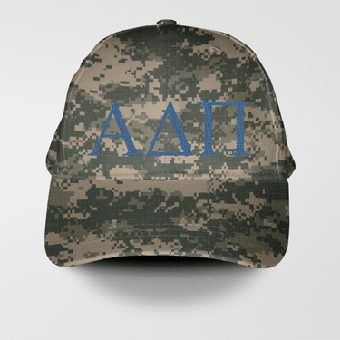 \nOrder your 1-color embroidered hat to match your shirt today! Comes in 2 camo colors. Each cap comes with your Greek symbols embroidered on the front in one color of your choice. You choose the color of the cap and the letter color. One size fits all, self-fabric closure with D-ring slider and tuck-in strap.\nNOTE: To enable the customization features, choose your embroidery style and then click the build your own button below.