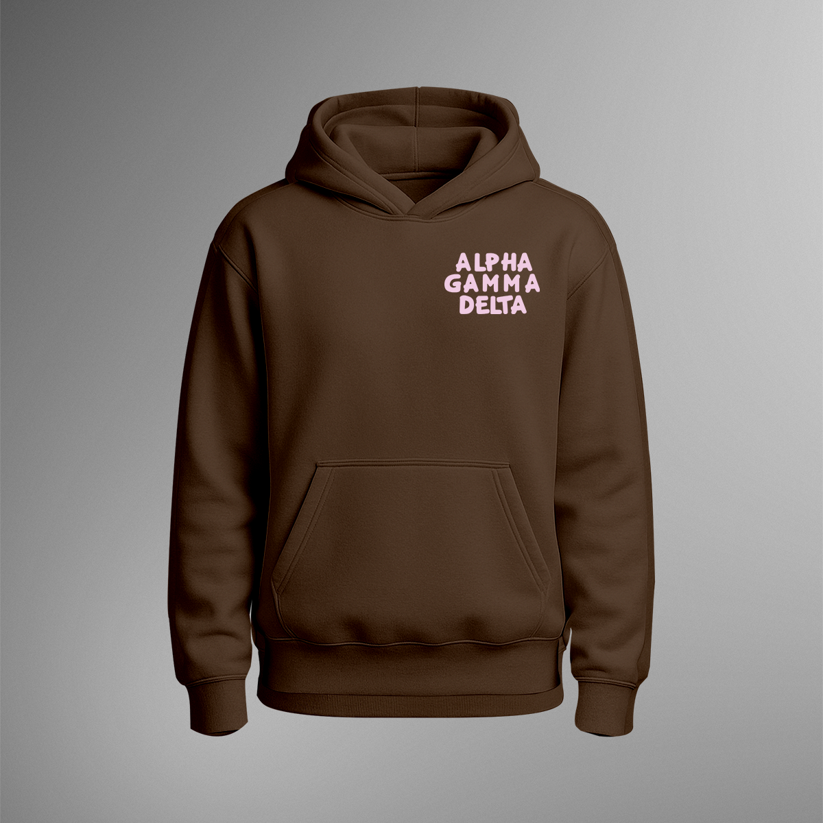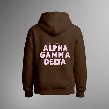 Show your Alpha Gamma Delta pride in style with this cozy brown hoodie featuring bold pink lettering and “EST. 1904” details. With a oversized fit, it features a printed design on the front and back.