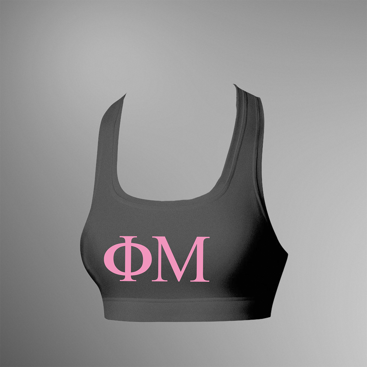 Stay stylish and comfortable with this Phi Mu matching sports bra and shorts set. Designed with the iconic ΦΜ Greek letters on the front and “I ♥ PHI MU” on the back, it’s perfect for workouts, Greek Week, or just showing off your sorority pride in style.