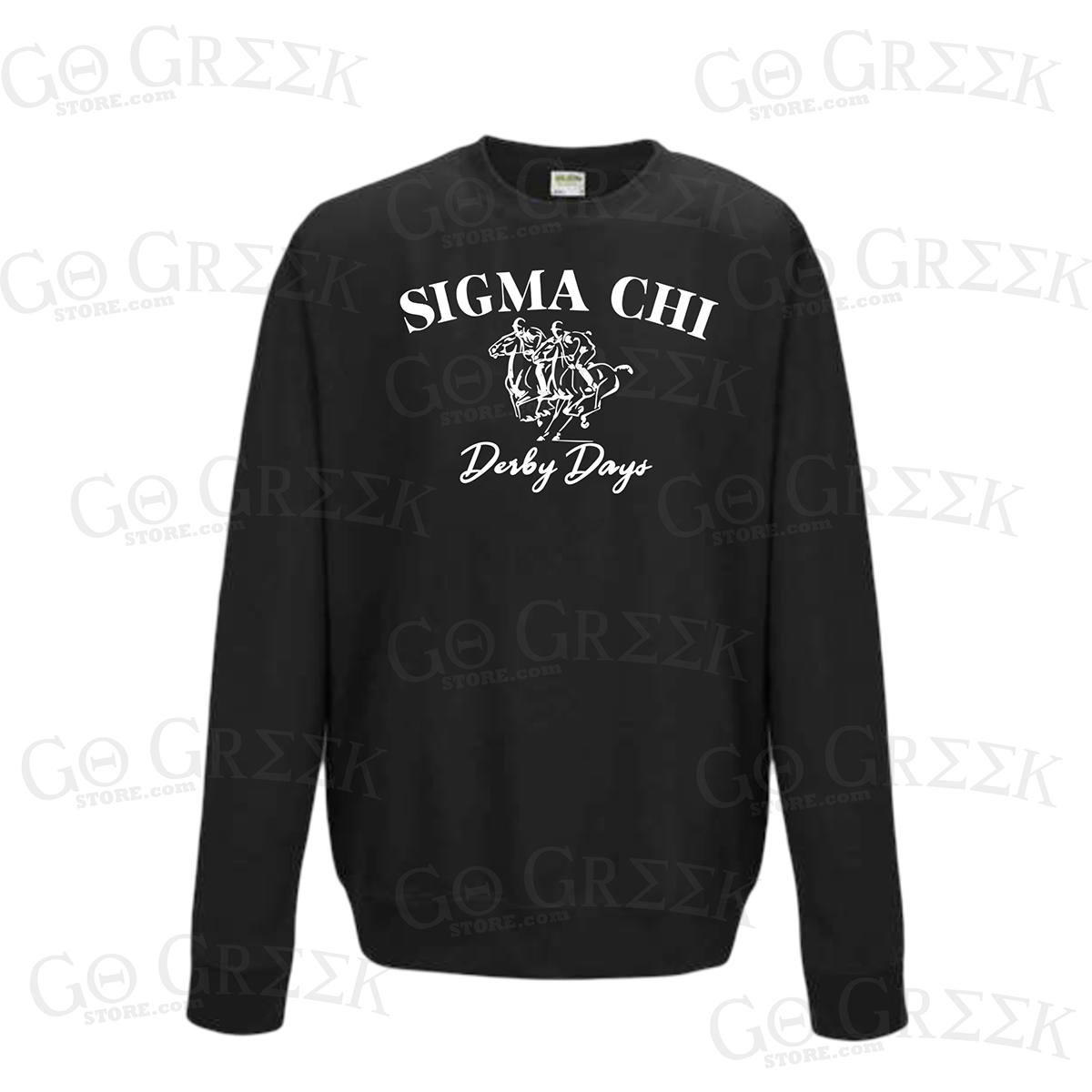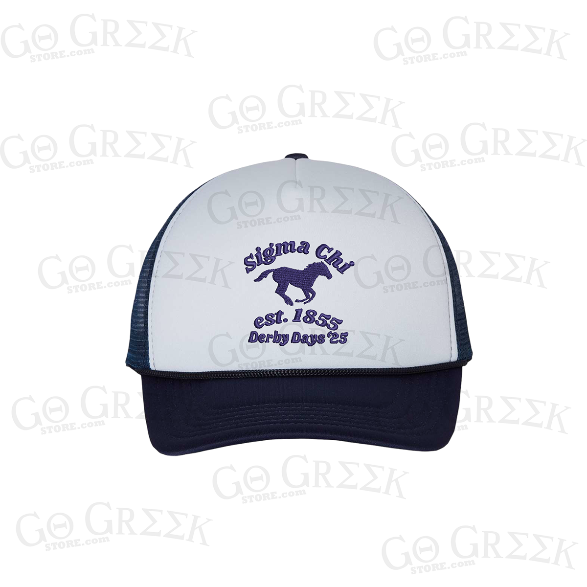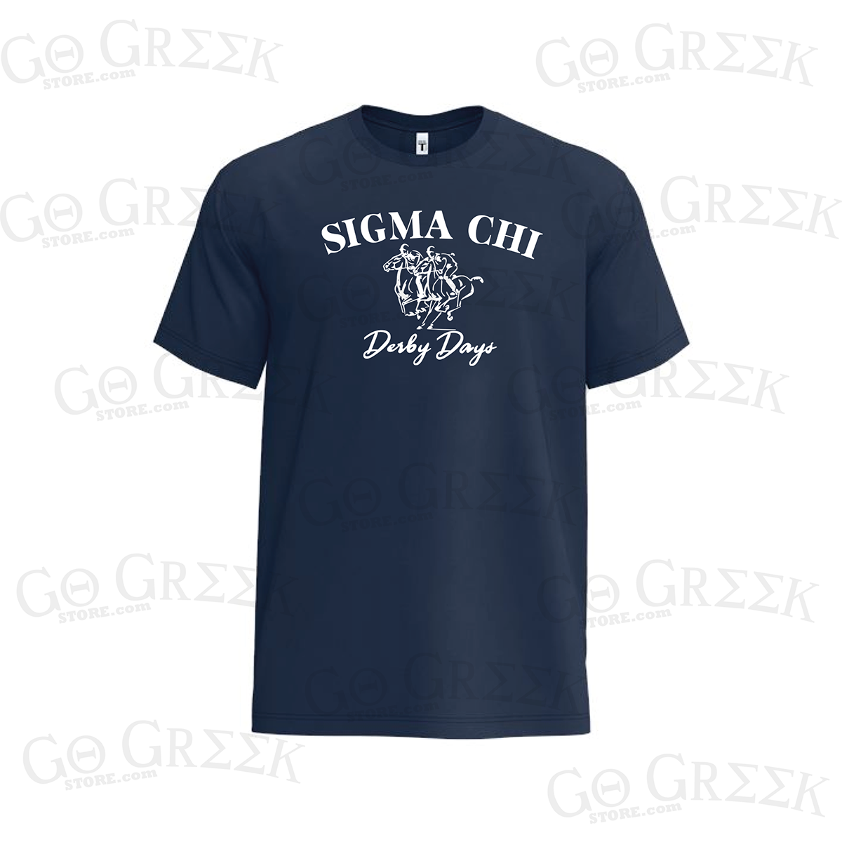Bold white & Navy “Sigma Chi Derby Days” lettering and the signature horse graphic