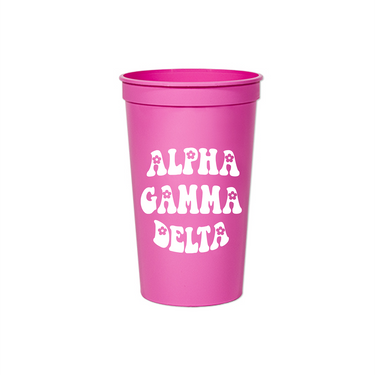 Show your Alpha Gamma Delta pride with this pink reusable 16oz stadium cup, featuring bold retro-style white lettering and flower-accented details. Designed for AGD sisters who love fun, bright, and stylish sorority merch, this cup is perfect for Bid Day, Big/Little reveals, recruitment events, sisterhood retreats, tailgates, and everyday use.