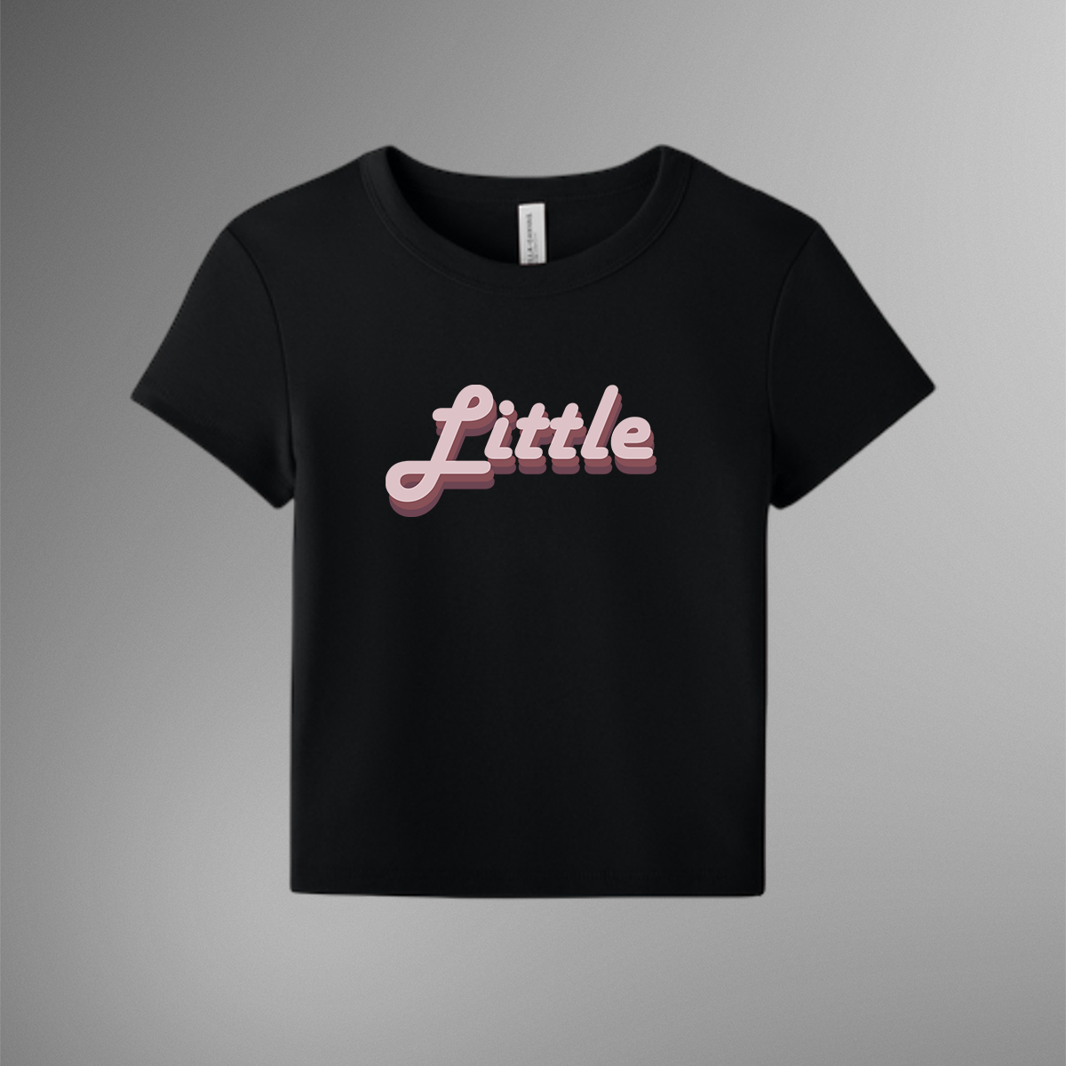 Celebrate your Big/Little bond with these trendy black baby tee featuring a retro pink “Big” and “Little” design.