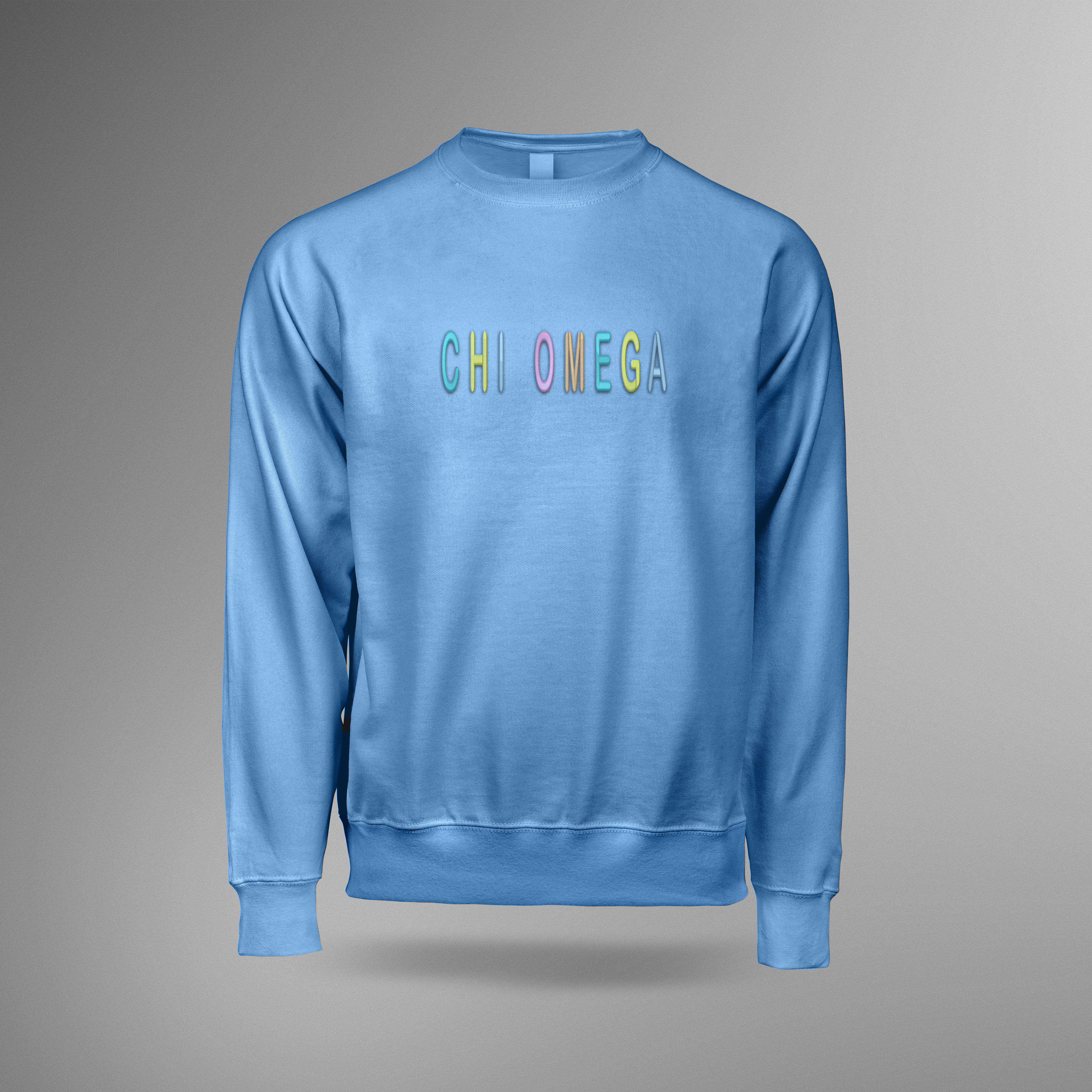 Chi Omega Rainbow Sweatshirt with Rainbow Embroidered Letters Carolina Blue
