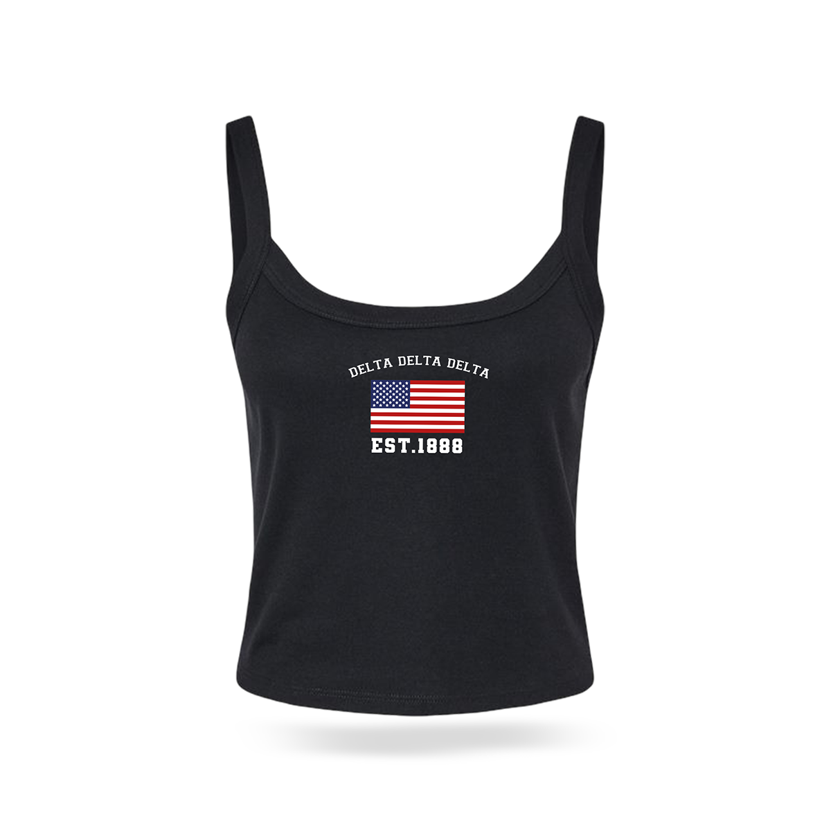 Show off your sisterhood pride with this Delta Delta Delta crop tank top, featuring a bold American flag design and “Delta Delta Delta Est. 1888” printed on the front. Designed with a flattering cropped fit and wide straps, this tank is perfect for warm weather, campus life, and sorority events.