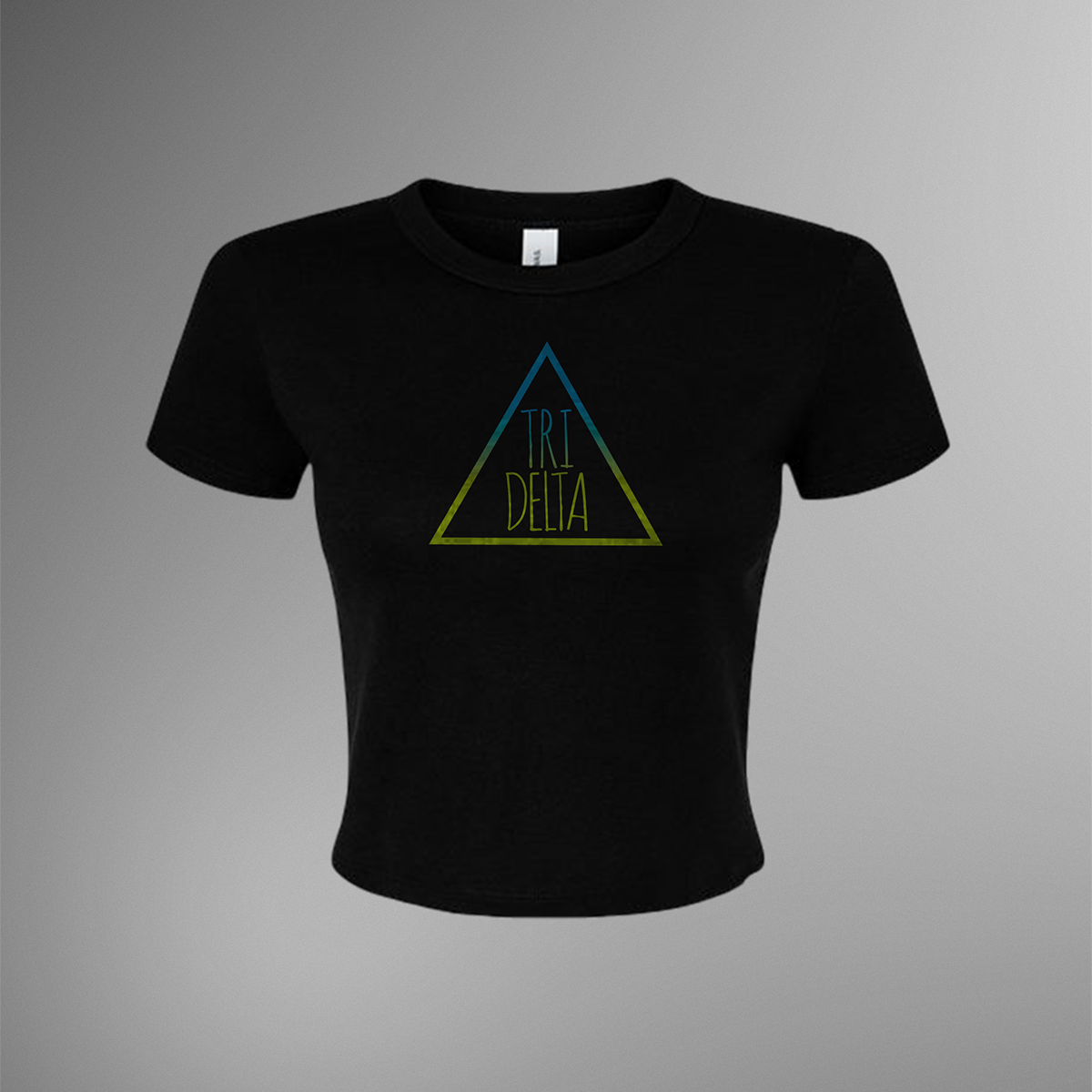 This black crop tee features a sleek geometric triangle graphic with gradient blue and green tones framing the Tri Delta name. Soft, breathable, and flattering, itโs perfect for bid day, recruitment, campus events, or casual everyday wear.