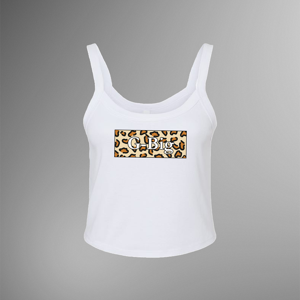 White cropped tank top with leopard cheetah print design reading ā€˜G-Big’ trendy sorority Big shirt for Greek life, Bid Day, and Big/Little reveal events White cropped tank top with leopard cheetah print design reading ā€˜G-Big’ trendy sorority Big shirt for Greek life, Bid Day, and Big/Little reveal events