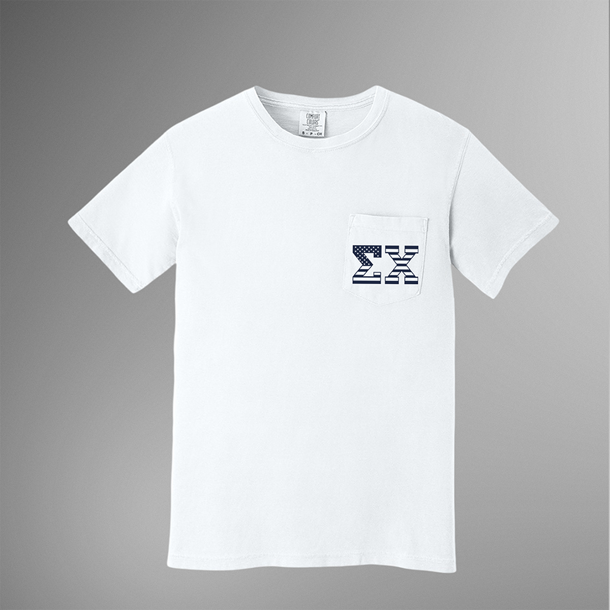 The Sigma Chi Pocket Tee is a timeless addition to every brother’s wardrobe. Made with soft cotton fabric and designed for comfort, this fraternity t-shirt features a clean white body and a left chest pocket with bold navy Sigma Chi Greek letters styled in an American flag stars-and-stripes print.