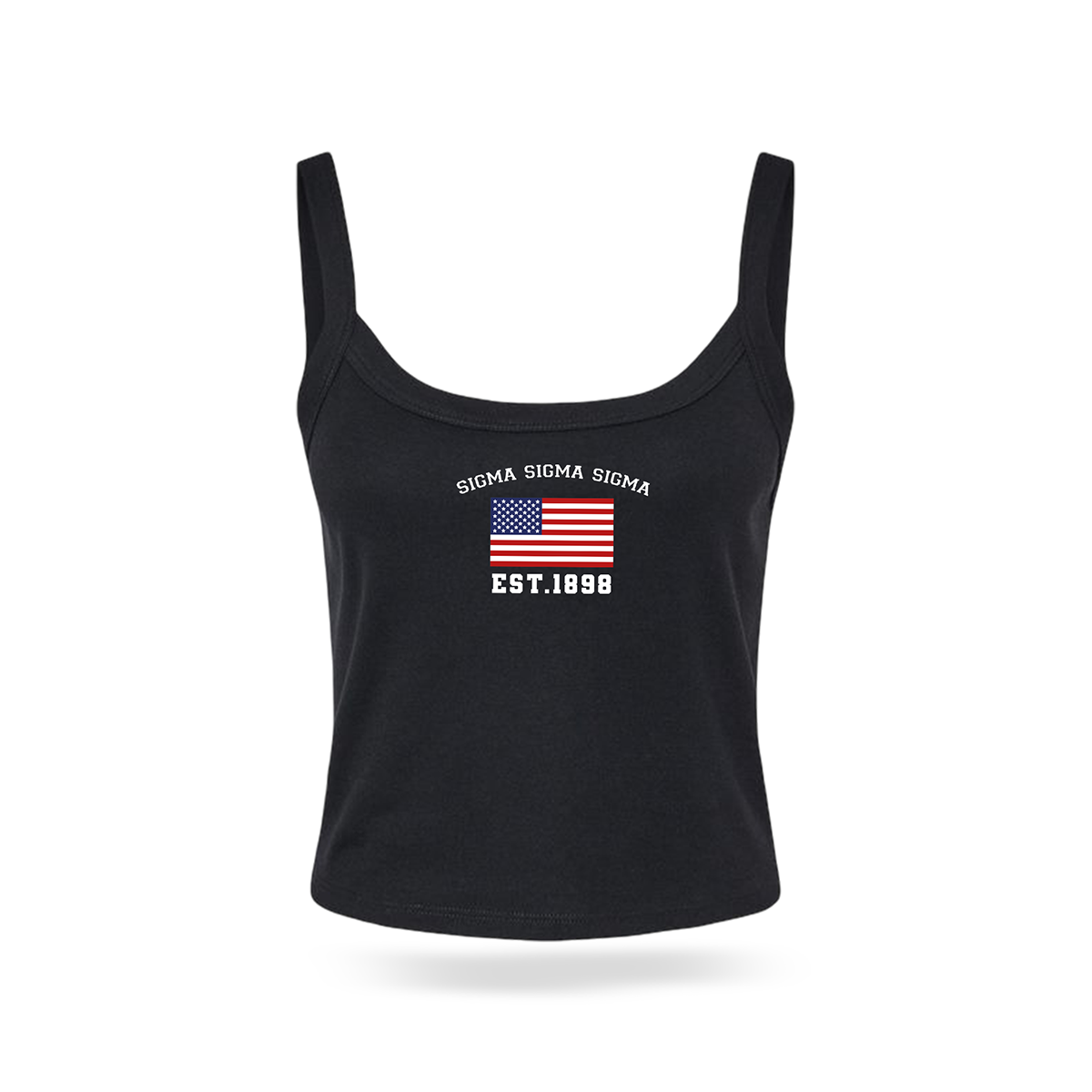 Show off your sisterhood pride with this Sigma Sigma Sigma crop tank top, featuring a bold American flag design and “Sigma Sigma Sigma Est. 1898” printed on the front. Designed with a flattering cropped fit and wide straps, this tank is perfect for warm weather, campus life, and sorority events.